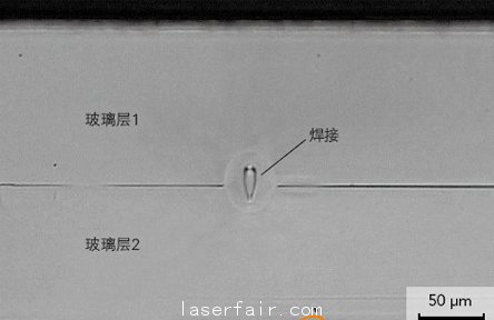 對于大部分精密的材料加工應用來說,在工件中產生的多余熱量是不需要的。然而,對于透明材料的微焊來說,精密控制的熱量積蓄對于融化材料并形成焊縫非常關鍵。聚焦的超短脈沖的高強度會引起透明材料中的非線性吸收,因此只會在兩種材料的接觸面上激光焦點周圍很小的區域內產生大量的熱量。每一個激光脈沖都會產生很少的熱量,如果焦點區域在下一個脈沖來之前就冷卻下來,那么這個熱量也就可忽略不計。如果脈沖之間的空間重疊以及脈沖重復頻率足夠高(數百kHz及以上),熱量將迅速地在這一區域積累并引起材料熔化??梢酝ㄟ^改變重復頻率及光束掃描速度來精確地控制熔化的量。這一技術已經在玻璃和塑料焊接上得到了應用。圖1展示了兩塊玻璃之間焊接面的截面。這種無需密封的高速、精確的焊接有許多好處,例如在制造太陽能電池板時面板邊緣需要密封,目前要用專門設計的密封膠和熱熔系統來完成。