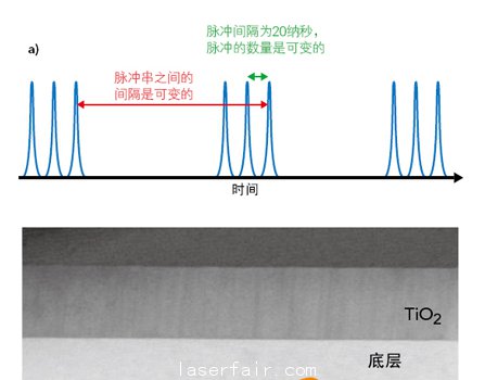 光纖激光體系可以直接從激光光源快速地輸出脈沖串,稱為脈沖串模式。例如,如圖2(a)所示,在進入放大階段之前,可以用聲光調制器從50MHz的振蕩器中篩選種子脈沖,最后輸出的是由多級脈沖組成的脈沖串,而且相鄰脈沖的間隔為20納秒。20納秒的脈沖間隔非常短,可以引起多重累積效應,包括靶標物的熱量以及燒蝕羽輝和緊隨其后的激光脈沖間的熱量,最終這將可以優化薄膜質量。圖2(b)展示了用這種方法沉積的TiO2薄膜。如圖中的透射電子顯微鏡圖(TEM)所示,薄膜的質量非常高,薄膜表面達到了原子級別的平滑程度,薄膜和基質間的界面也很平滑。用光學顯微鏡觀察100毫米的區域也沒有發現大的熔滴。