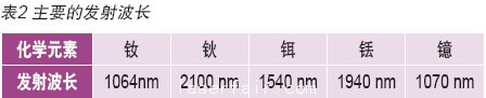 從表1中我們可以看到,相鄰的鈥、鉺、銩和鐿(Yb)元素具有相似的物理性質和電子結構。這在一定程度上解釋了為什么它們都在活躍的光纖中作為摻雜物。然而,發射波長并沒有隨著元素周期表中原子序數的增加而增加,其原因超出了本文的范圍,表2 中給出了主要的發射波長。