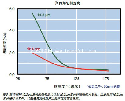 大部分用于包裝應(yīng)用的聚合物膜的紅外吸收光譜包括很多個(gè)峰值。因此, 激光器波長中的微小偏移會對吸收效率造成巨大的影響。而且,由于包裝涉及的膜非常薄,通常只吸收小部分的入射激光功率,因此吸收效率的小幅上升就可能會大大提高加工速度和效率。因此,雖然采用傳統(tǒng)10.6μm波長的CO2激光器最常用于包裝應(yīng)用,但是經(jīng)證實(shí)用于某些塑料材料(尤其是聚丙烯和雙向拉伸聚丙烯 (BOPP)時(shí),輸出為10.2μm 的CO2激光器的加工速度更快且效果更勝一籌。同樣,用于聚酰亞胺(PI)、硅膠、三氯化聚乙烯(PET)、聚丙烯(PP)和聚苯乙烯(PS)時(shí),輸出為9.3μm的CO2激光器表現(xiàn)出更快的加工速度和更勝一籌的效果。Coherent生產(chǎn)了可選擇10.6μm、10.2μm或9.3μm輸出的J系列CO2激光器, 專門用于滿足這些應(yīng)用的需求。