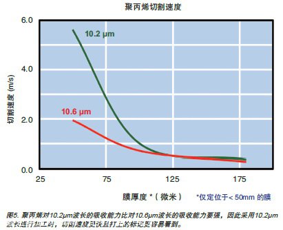 大部分用于包裝應(yīng)用的聚合物膜的紅外吸收光譜包括很多個(gè)峰值。因此, 激光器波長(zhǎng)中的微小偏移會(huì)對(duì)吸收效率造成巨大的影響。而且,由于包裝涉及的膜非常薄,通常只吸收小部分的入射激光功率,因此吸收效率的小幅上升就可能會(huì)大大提高加工速度和效率。因此,雖然采用傳統(tǒng)10.6μm波長(zhǎng)的CO2激光器最常用于包裝應(yīng)用,但是經(jīng)證實(shí)用于某些塑料材料(尤其是聚丙烯和雙向拉伸聚丙烯 (BOPP)時(shí),輸出為10.2μm 的CO2激光器的加工速度更快且效果更勝一籌。同樣,用于聚酰亞胺(PI)、硅膠、三氯化聚乙烯(PET)、聚丙烯(PP)和聚苯乙烯(PS)時(shí),輸出為9.3μm的CO2激光器表現(xiàn)出更快的加工速度和更勝一籌的效果。Coherent生產(chǎn)了可選擇10.6μm、10.2μm或9.3μm輸出的J系列CO2激光器, 專門用于滿足這些應(yīng)用的需求。