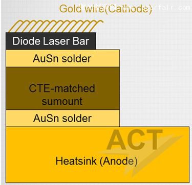 2013年12月,西安炬光科技有限公司宣布推出全金錫焊料封裝傳導(dǎo)冷卻半導(dǎo)體激光器單Bar HCS02系列新品,該封裝技術(shù)不僅在submount與bar條之間采用金錫焊料,且在submount與heatsink之間采用金錫焊料,真正實(shí)現(xiàn)了半導(dǎo)體激光器的全金錫焊料封裝,產(chǎn)品結(jié)構(gòu)如圖所示。