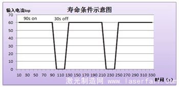 采用全金錫焊料封裝HCS02系列產品非常適用于工業和科研領域,尤其是在硬脈沖(hard pulse-on and off operation)工作條件下的應用。如圖2和圖3所示,西安炬光科技有限公司研發的FL-HCS02-50-825產品在25度,恒流60A下以90s開、30s關的條件進行壽命測試,結果顯示壽命測試時間已經突破了8000h。這種hard pulse on and off模式非常考驗產品的抗熱疲勞效應,如果是采用銦焊料(或者其他soft solder)進行焊接,極容易被這種hard pulse 條件破壞焊料層,形成銦焊料的失效,進而導致產品失效。而采用全金錫焊料封裝的FL-HCS02-50-825完全可以從根本上解決這一問題。