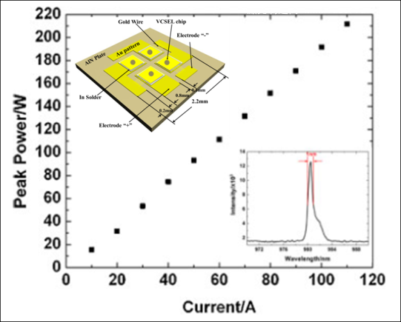 中國科學院長春光學精密機械與物理研究所大功率激光研究組開發出了利用4個高功率垂直腔面發射半導體激光器(VCSEL)單管串接形成的百瓦級980nm波段高功率準列陣模塊。該模塊采用全自主化設計的芯片結構及模塊結構,模塊尺寸僅有2.2mmX2.2mm,輸出功率高達210W,這是單管VCSEL模塊迄今為止所報道的最高功率指標。該突破使得微小型高功率VCSEL模塊有望在激光引信、激光測距及激光面陣雷達系統中實現實用化。該成果已正式發表(JJAP 53,070303,2014),并得到了國際光電類期刊Semiconductor TODAY 的關注。