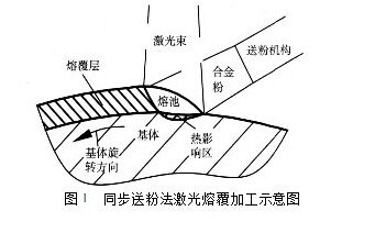 試驗前將45號鋼棒料待熔覆面用砂紙打磨(表面粗糙度Ra=0.8um)并用丙酮清洗干凈吹干,采用同步送粉法進行激光熔覆實驗,實驗加工示意圖如圖1 。