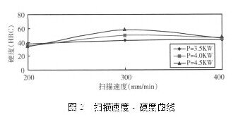 從測量的硬度變化可以看出。在速度較低時,當掃描速度一定時,隨著激光功率的增加,表面硬度有所下降。但是當掃描速度加快時,隨著激光功率的增加,熔覆層表面硬度又越來越高。當功率一定時,掃描速度越快,硬度越高。到一定的速度又有所下降,硬度變化規律用曲線表示如圖2 :
