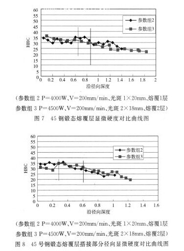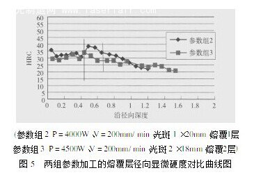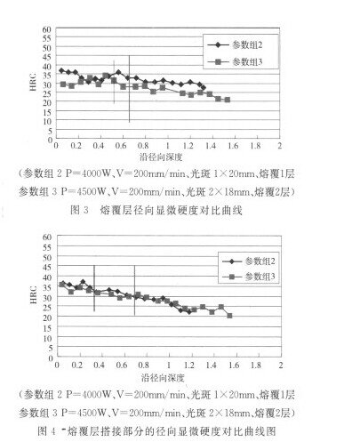 從圖3和圖4中看出,以兩組參數加工的熔覆層的硬度相差不大,基體熱影響區的硬度有所差別 ,