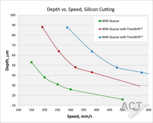 圖3:硅片切割深度與切割速度的曲線圖,圖中顯示了使用TimeShift技術所實現的加工優化所帶來的益處。