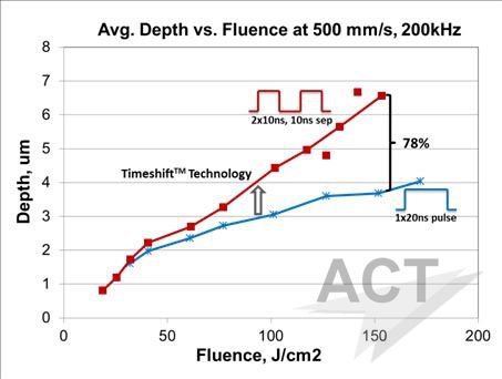圖5:氧化鋁劃片深度與能量密度的關系,顯示了TimeShift技術在提升吞吐量方面的益處。