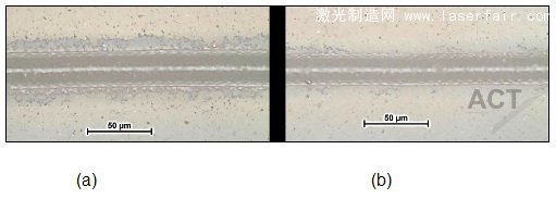 圖4:硅片切割質量對比。(a)利用單脈沖切割的俯視圖,切割深度20mm。(b)利用5個子脈沖切割的俯視圖,切割深度25mm。