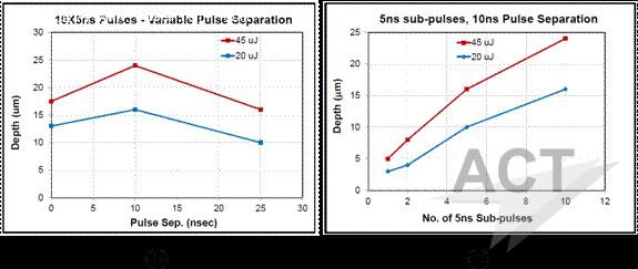 圖5顯示了采用雙脈沖突發模式微加工相對單脈沖加工的明顯優勢。根據能量密度水平,通過將單個20ns脈沖的能量分裂到兩個子脈沖中,可以實現消融深度增加高達78%。