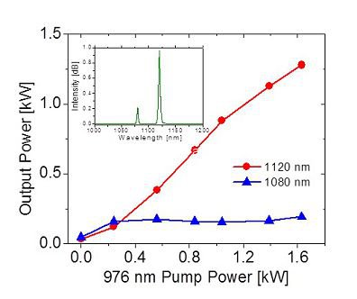 該項研究中,在一般的高功率摻鐿光纖放大器中注入兩個或多個波長的種子激光,波長間隔對應光纖的拉曼頻移量。處于鐿離子增益帶寬中心的種子激光率先獲得放大后,在后續(xù)光纖中作為泵浦激光對拉曼斯托克斯激光進行逐級放大。初步的演示實驗獲得了300 W的1120nm拉曼光纖激光輸出;接著采用較大包層(400mm)的光纖,獲得了580W的單橫模線偏振拉曼光纖激光和1.3kW的近單模拉曼光纖激光輸出。結(jié)果發(fā)表于《光學快報》(Optics Letters)和《光學快訊》(Optics Express) [Opt. Lett. 39, 1933-1936 (2014); Opt. Express 22, 18483 (2014)]。鑒于目前高功率摻鐿光纖激光器均采用主振放大結(jié)構(gòu),新提出的光纖放大器結(jié)構(gòu)可用于進一步提升拉曼光纖激光的輸出功率。初步的數(shù)值計算也表明,該技術方法有望在1~2mm范圍內(nèi)任意波長獲得千瓦級激光輸出。