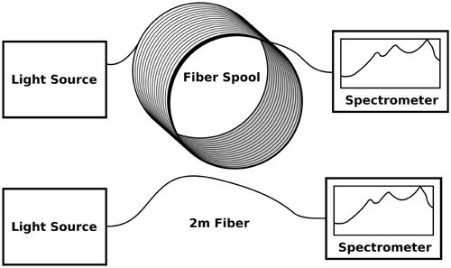 圖1使用了回截方法(cutback method)來測試衰減。光被發射通過測試樣品的整個長度,然后光譜儀記錄接收到的光譜。隨后,樣品被剪短到2m長,而光譜儀也記錄該光譜。比較兩個波長的光譜,計算衰減作為波長的函數。