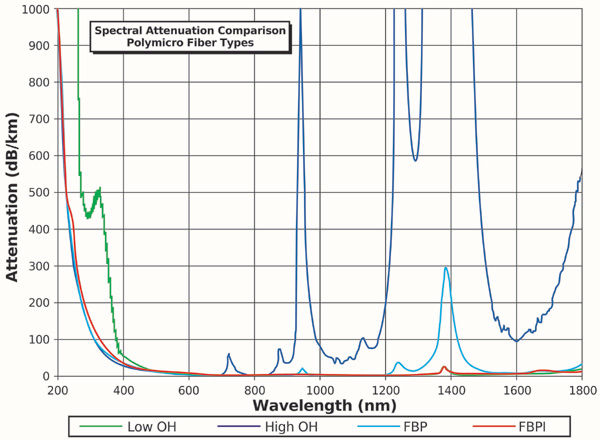 下圖2顯示了比較FBPI與其它三種Polymicro光纖的光譜衰減性能圖: