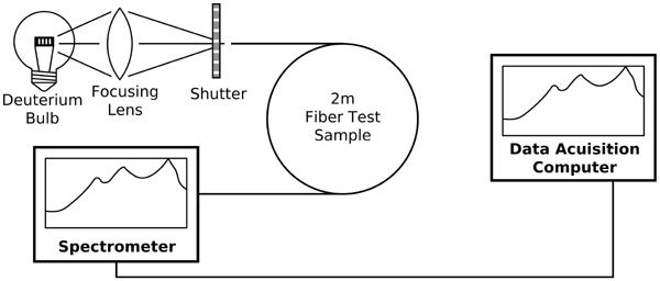 FBPI光纖的衰減性已在三個不同的波段內進行了嚴格測試:1) UV (200-400 nm);2) 可見光(Visible) (400-900 nm);和3) NIR (900-2100 nm)。每種測試使用了Ocean Optics公司專為特定波長范圍設計的光纖光譜儀。因為在不同波長范圍上具有不同的衰減,所以使用不同的光纖長度以獲得最佳測試靈敏度。具體來說,15 m長的用于UV范圍測試,而大約200 m長的則用于可見光和NIR測試。用于UV測試的光源為氘燈,而可見光和NIR測試的光源則為鎢鹵素燈(Tungsten-halogen)。
