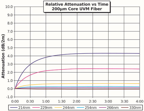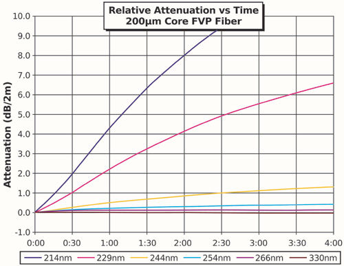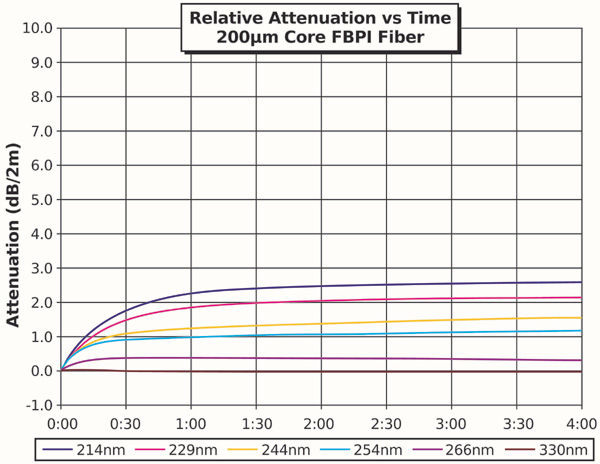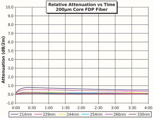 在整個測試過程中跟蹤六個重要的波長(214、229、245、255、266和330 nm),同時也測量整個光譜,并在測試的開始和結束時進行比較。隨著測試的進行,每個波長的性能下降速率在減小,在理想情況下,在四小時測試結束前達到飽和點。在UV光纖中,能夠快速飽和,而且性能下降最少的是最理想的品質。飽和下的性能下降程度大多數與光強度無關,增加強度往往僅改變達到飽和的速度。