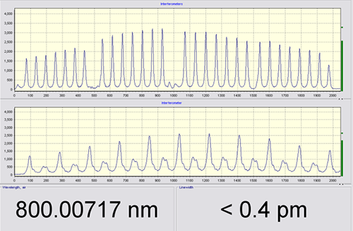 針對極窄線寬可調諧深紫外激光的應用研究任務,中國科學院物理研究所/北京凝聚態物理國家實驗室(籌)光物理重點實驗室魏志義研究組基于他們摻鈦藍寶石激光研究的經驗,近年來通過深入系統的研究工作,相繼克服了壓縮線寬、穩定頻率、精調波長、提高增益等技術難題,部分工作已發表于Applied Optics等雜志上【Appl. Opt., 51: 1905(2012)及Appl. Opt., 51:5527 (2012)】。最近,魏志義研究員、滕浩副研究員及博士研究生王睿在進一步成功獲得平均功率6.5W、線寬小于0.4pm的可調諧窄線寬納秒鈦寶石激光的基礎上,通過與福建物質結構研究所洪茂椿、陳長章、林文雄研究員合作,利用他們最新研制成功的BBSAG (Ba1-xB2-y-zO4SixAlyGaz)晶體四倍頻該激光,在195~205nm的深紫外波長范圍內獲得了線寬小于200MHz、單頻穩定性優于50MHz、調諧步長小于50MHz的可調諧窄線寬穩頻激光輸出,最高輸出功率達130mW。圖1為波長計測量到的基頻光典型線寬結果,圖2依次為各階諧波的調諧曲線,對比BBO晶體,BBSAG在紫外波段不僅倍頻效率提高了25%,而且由于近兩倍高的光學破壞閾值、更高的硬度及完全不潮解的特性,表現出更加優良的連續穩定運行時間及可靠的線寬穩定性、精確的波長調諧能力,可望作為一種新的紫外非線性晶體,在激光科學技術中發揮重要作用。目前該激光器已在合作單位取得成功應用。