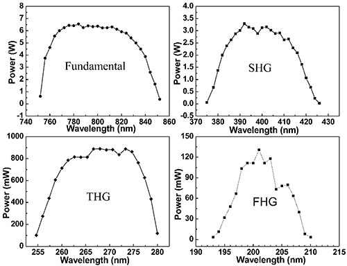 圖2 各次諧波的光譜調諧范圍,采用BBSAG的四倍頻激光的調諧范圍約從193~210nm。最高平均功率135mW。