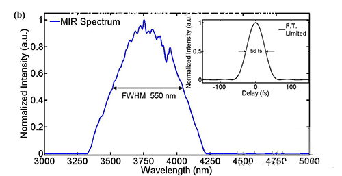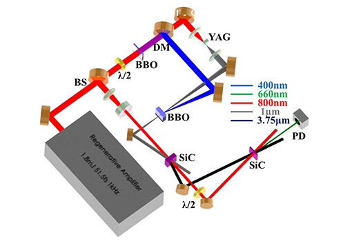 針對4H-SiC晶體的特點及中紅外飛秒激光的發(fā)展需求,在2013年合作的基礎上,光物理重點實驗室L07組的博士生范海濤、副研究員王兆華和先進材料與結構分析實驗室A02組的博士生徐春華、副研究員王剛等人進一步合作,改用L07組自建的飛秒鈦寶石激光放大器作為泵浦激光、A02組新生長的高質(zhì)量4H-SiC晶體作為非線性晶體,通過飛秒激光參量放大研究獲得了能量大幅度提高的寬帶中紅外激光輸出。實驗中他們將鈦寶石放大器輸出的激光分為三部分(圖1),一部分用于產(chǎn)生穩(wěn)定的單絲白光超連續(xù);另一部分倍頻后泵浦BBO晶體放大白光超連續(xù)中波長1μm的成分;第三部分泵浦4H-SiC晶體繼續(xù)放大1μm信號光的同時,獲得了中心波長3.75μm、單脈沖能量17μJ、能量穩(wěn)定性優(yōu)于1.5%的中紅外閑頻光。實驗中采用理論計算獲得的最佳非共線角(2.3°)使得晶體中信號光與閑頻光很好地滿足群速匹配,獲得了半高寬550nm的超寬帶閑頻光光譜(圖2),支持56 fs的傅里葉極限脈沖,實驗測量結果表明實際的激光脈寬為70fs。相比2013年的結果,不僅單脈沖能量提高了近兩個量級,而且脈沖寬度也僅6個光學振蕩周期左右。相關結果發(fā)表在Optics Letters后,進一步入選Spotlight on Optics焦點關注文章 (Highlighted Articles from OSA Journals)。