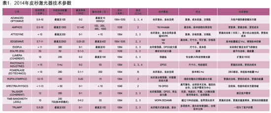 在撰寫這篇文章時(shí),我們與所有參加了2013年調(diào)查的公司進(jìn)行了聯(lián)系,并請他們更新了數(shù)據(jù)。此外,許多不在之前名單上的公司也被邀請參與此次調(diào)查,2013年調(diào)查時(shí)他們或是沒有囊括入名單中,或是不愿意參與,或是當(dāng)時(shí)他們還沒有涉足超短脈沖激光器領(lǐng)域。因此本次的名單更為完整,但這絕不是一個(gè)完整的調(diào)查。名單被劃分為皮秒激光器和飛秒激光器;公司在表中的位置是由他們自己選擇的。