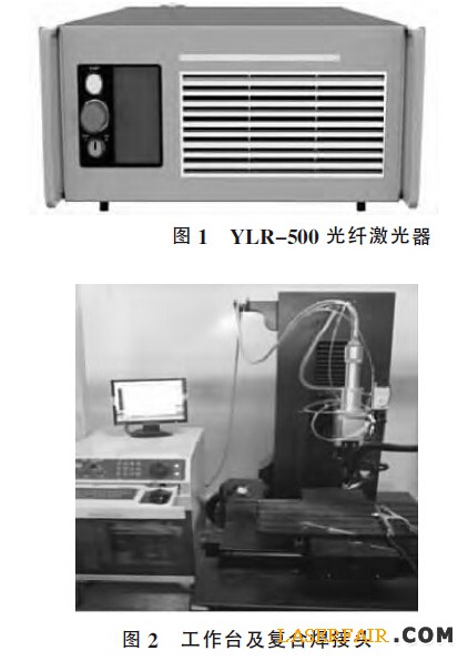 試驗采用德國IPG 公司生產的YLR-500 單模光纖激光器,如圖1 所示,激光功率500 W,TIG焊接機采用日本松下TIG 焊機,并使用自制的激光-TIG復合焊頭及三維工作平臺進行焊接試驗,工作臺及復合焊頭如圖2 所示。