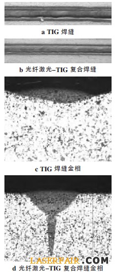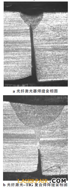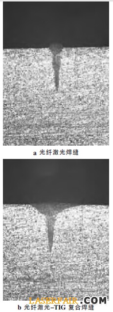 圖5 光纖激光與光纖激光-TIG 復合焊的金相圖對比