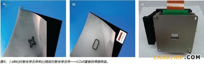 如果要求加工時間短和/或不能移動部件,那么應該優先選擇使用同步焊接。根據焊接形狀的復雜性,可以使用折射或衍射光學元件。簡單的形狀例如環形,可以通過特殊的透鏡來形成,而更復雜的形狀,例如橢圓形、正方形,原則上可以通過使用衍射光學元件生成2D形狀。每個焊接形狀通常都是根據客戶的需求定制的,同步焊接的衍射光學元件也是如此。由于要在玻璃基板的表面蝕刻特定的衍射結構,衍射光學元件的價格不菲,但是可以承受。此外,衍射光學元件衍射產生的光束形狀是固定的。這一限制可以通過使用類似程控衍射光學元件——硅基液晶(LCoS)基板來克服。