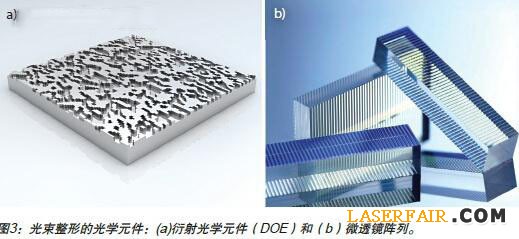 在衍射方法中,衍射光學元件(DOE)定位在準直激光束的傳播路徑上。衍射光學元件表面的極小的結構能按照預想的形狀和強度設置來衍射激光光束(圖3)。衍射方法的優點在于可以修改激光光斑的大小和強度。此外,衍射光學元件不需光學對準。因此,可以容易、快速地通過更換衍射光學元件來改變焊縫寬度,而無需更改任何透鏡和工作距離。衍射技術的缺點是相比折射方法具有較高的光損耗,并且根據不同的要求,需要更高亮度的激光源——光纖激光器。