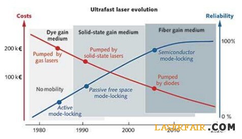 圖1 超快激光器演變過程,從最初的染料激光器到最近的固態和光纖激光器