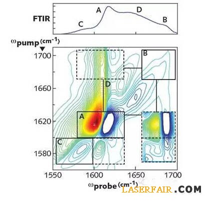 例如,Astrella放大器在二維紅外(2DIR)光譜中的應用。Henrich介紹說傳統的紅外吸收光譜通常是通過傅里葉變換紅外(FTIR)儀獲得的,每個峰值對應一個不同的分子振動,但是沒有頻譜信息描述振動之間的關系。2DIR利用兩個獨立波長(泵浦和探測)揭示了這些關系并繪制了正交軸兩個波長的數據。如果一個2DIR光譜是同一類成對峰值的混合記錄,會產生非對角交叉峰值。2DIR被證明是生命科學領域一個非常重要的工具,具備研究生物分子之間聯系和互動的獨特能力;例如,蛋白酶結合以及蛋白質折疊展開(如圖2所示)。