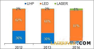 2014年LED光源產品銷量占到了87%,已經成為DLP拼接單元的標配。