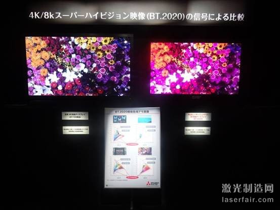 使用新型RGB激光背光單元的50寸4K液晶顯示屏(右)和使用傳統(tǒng)技術(shù)的4K液晶顯示屏(左)