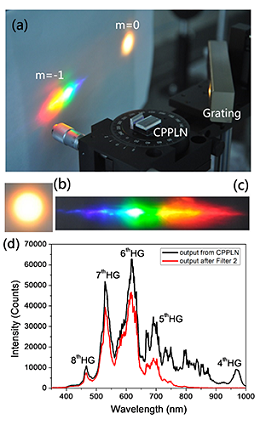 課題組用中紅外飛秒脈沖激光器進行實驗,當中紅外的飛秒激光(脈沖寬度115 fs, 平均功率20 mW, 帶寬3400-3800 nm, 重復頻率1 kHz,峰值功率0.17 GW)進入啁啾結構的樣品后,在輸出端看到了一個非常亮的白光光斑,用光柵對輸出光進行分光得到了0階和-1階的衍射光斑(圖3),充分反映了從啁啾結構樣品輸出的光具有超連續寬帶的可見光分布。經仔細的分析和計算,得到晶體內部的轉換效率約為18%(可見光波段400-800 nm),遠高于用強激光轟擊原子氣體和等離子體獲得高次諧波的轉換效率。其中,各階諧波的轉換效率分別為:四次諧波(850-950 nm)~0.7%, 五次諧波(660-850 nm)~4.5%,六次諧波(560-660 nm)~7.2%,七次諧波(485-560 nm)~5.1%,八次諧波(350-485 nm)~1.2%。實驗結果表明,經過特殊的設計,高階諧波的轉換效率可遠高于低階諧波。