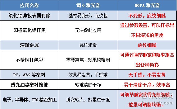 除了以上的幾個應用案例外,MOPA激光器與調Q激光器還存在很多不同的應用差別,在這里列舉了一部分典型的應用案例,如下表格: