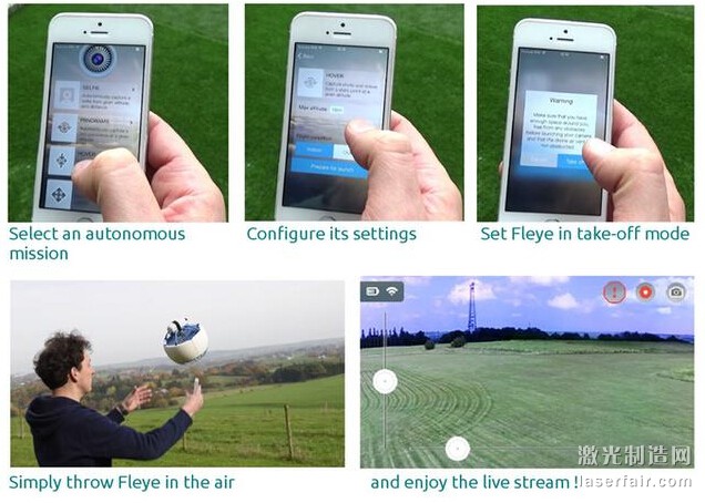 而且,Fleye 操作起來也異常的容易。帶上你的手機,點開對應的 App 選擇好工作模式,就可以把它丟到空中了。他可以實現自拍、全景、虛擬三腳架等多重功能,絕對比很多天天在微博里裝 13 的那些自稱圈兒里老人兒牛 X 得多。