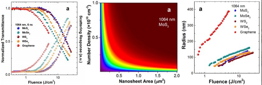 研究小組(董寧寧等)還系統研究了液懸態過渡金屬硫化物二維納米材料在納秒脈沖激光作用下的可見—近紅外寬帶光限幅效應。研究表明,在近紅外波段硒化物比硫化物具有更優異的光限幅特性?;谝簯B分散系統,創新提出了納米片數密度的計算方法,建立了激光能量與散射中心尺寸的關系,對于研究過渡金屬硫系化合物中Mie散射誘導的光限幅效應非常重要。相關論文發表在Scientific Reports 雜志(Scientific Reports, 5, 14646)。