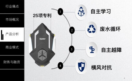 清潔速度方面,張華龍告訴36氪,ispider基于自學(xué)習(xí)技術(shù),前后速度有所不同。第一次時(shí),ispider會(huì)對建筑的外墻面情況進(jìn)行學(xué)習(xí),并通過GPRS與后臺(tái)通信,清洗速度和人差不多,之后的清洗,由于機(jī)器已經(jīng)熟悉了墻面情況,速度可以達(dá)到人的 10 倍。