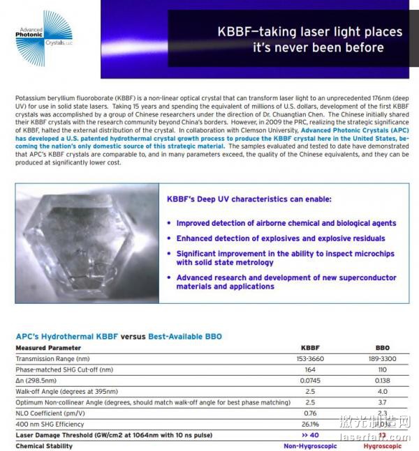 KBBF在高功率狀態下紫外線性能比上一代BBO晶體性能好兩倍,并能夠用于制造超高速激光掃描設備,這將大大提高美國國防和國土安全威脅探測能力,對美國科學研究和精密測量能力的提高而言,KBBF具有“規則改變者”的意義。目前APC公司還在繼續進行這種產品的開發。(APC公司聲明譯完)