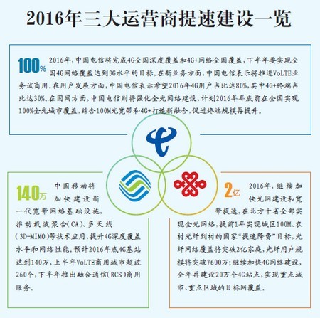 根據(jù)三大運(yùn)營(yíng)商各家的2016年的規(guī)劃,高速光纖寬帶網(wǎng)絡(luò)和4G+是有線端和無(wú)線端的兩個(gè)投資重點(diǎn)。