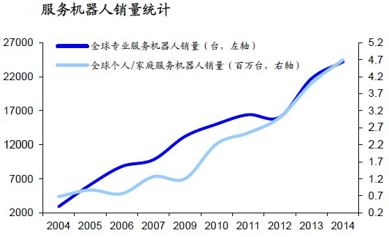 服務機器人有望成為繼電腦、手機之后的新一代智能終端,成為連接虛擬世界與現實世界的重要載體。根據應用場景的不同,IFR將機器人分為工業機器人和服務機器人。工業機器人主要為企業生產制造服務,對企業而言,是一項資產的投資,而服務機器人的多種類、多功能,使其在日常生活中運用更為廣泛,更加貼近終端消費者,更有可能實現標準化生產,擁有類似于3C產品的消費屬性,我們預期在不久的將來,服務機器人有可能會復制實現21世紀初智能手機、平板電腦等電子消費品的快速普及。