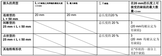一個焊接接頭通常應針對不同缺陷類型分別進行評估,下表中規定了缺陷及限值。