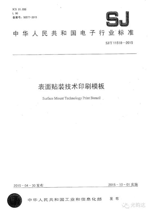 2015年, 中國工業和信息化部批準了由深圳光韻達光電科技股份有限公司(股票代碼:300227.SZ)發起及起草制定的《表面貼裝技術印刷模板》行業標準 ,認可我公司在SMT模板制造行業的突出貢獻,本標準也是目前經國家部委認定的首個表面貼裝印刷模板的相關規范。