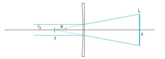 這是柱面鏡最廣泛的應(yīng)用。如下圖所示,半徑為r0的準直光源射入一面焦距為-f的平凹柱面透鏡(圖片為了更清晰地闡述原理而將光束半徑放大顯示)。光束會以半角θ發(fā)散(θ = r0/f)。此時,也可近似看作是位于焦點-f處的點光源的發(fā)散。在透鏡后方距離為z的位置,雖然線光束寬度仍為2r0(忽略高斯光斑的發(fā)散),但其長度變?yōu)?/span>