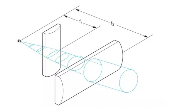 激光二極管輸出光束以不對稱形式發(fā)散,其準直工作具有較大的挑戰(zhàn)性。例如,對于發(fā)散角θ1 x θ2 = 10° x 40°的二極管光源,如果僅用標準的球面透鏡,只能在單一方向上進行準直,另一方向則會發(fā)生發(fā)散或匯聚。使用柱面鏡可以將該問題分解到兩個一維方向,通過將相互正交的兩塊柱面鏡組合使用即可實現(xiàn)兩個方向同時準直。