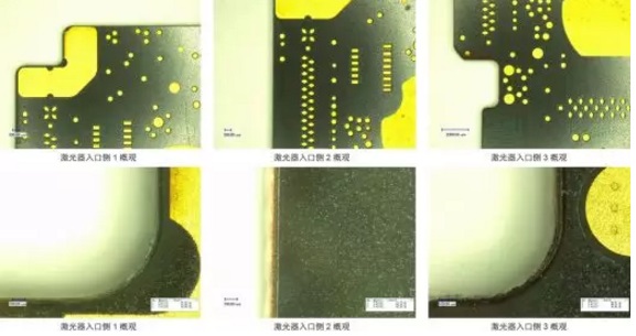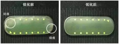 圖 4. 綠光 超短脈沖激光器切割指紋傳感器,工藝優(yōu)化前后。工藝優(yōu)化基本上消除燒灼和碎屑(白層)。所示樣本未經(jīng)過(guò)清理。