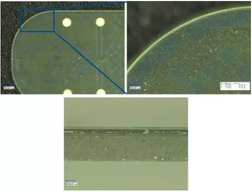 圖 5. 經(jīng)過(guò)工藝優(yōu)化,超短脈沖 激光器切割的指紋傳感器的邊緣和截面細(xì)節(jié)顯示切口很平整、質(zhì)量非常高。所示樣本未經(jīng)過(guò)清理。