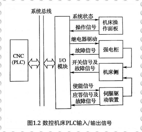 (3)PLC 在電氣控制柜中,而輸入/輸出接口在機床一側,如上圖1.1 c)所示。這種配置方式使 CNC 與機床接口的電纜大為減少。 下圖 1.2 所示為數控機床PC 輸人/輸出信號示意圖。