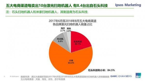 這份2017年6月——2018年8月五大電商渠道個品牌激光掃地機器人銷量占比數(shù)據(jù)顯示:小米掃地機器人占比64.4%,石頭科技掃地機器人占比20.1%,科沃斯掃地機器人占比9.8%,海爾掃地機器人占比2.7%,其他占比3%,可以說小米和石頭科技成了最大贏家,直接占據(jù)了84.5%的市場份額。并且小米掃地機器人其實也是石頭科技制造的,也就是說石頭科技間接占據(jù)了84.5%的份額,也就是說每賣出10臺激光掃地機器人有8臺出自石頭科技,可以看出這個品牌的產(chǎn)品確實是很受消費者喜歡!