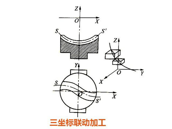②三坐標聯動加工。內循環滾珠螺母的回珠器其滾道母線SS'為一條空間曲線,它可用空間直線去逼近,可在有空間直線插補功能的三坐標聯動床上加工。但是編程計算較復雜,其加工程序可采用自動編程系統來編制。