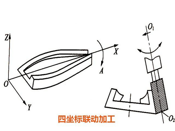 ③四坐標聯動加工。所示的飛機大梁其加工表面是直紋扭曲面若用三坐標聯動機床和球頭銑刀加工,不但生產率低,而且零件表面的表面粗糙度也很差。以采用圓柱銑刀周邊切削方式,在四坐標機床上加工,除三個移動坐標的聯動外,為保刀具與工件型面在全長上始終貼合,刀具還應繞O1(或O2)做擺動聯動。此擺動聯動導致直線移動坐標要有附加的補償移動,其附加運動量與擺心的位置有關,也需在編程時進行計算。加工程序要決定四個坐標軸的位移指令,以控制四軸聯動加工,因此編程相當復雜的。